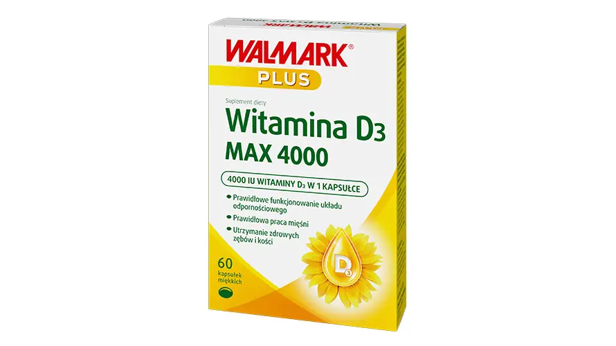 Suplementy diety Walmark PLUS Witamina D3 Max 4000 zawiera najwyższej jakości witaminę D3, która wspomaga: